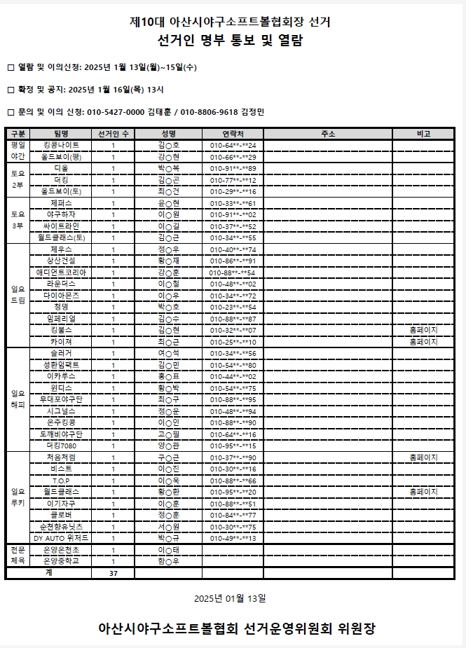 안녕하십니까? 경기 이사 김태훈 입니다. * 2025년 협회장 선거 관련 선거인 명부 이의 신청 각팀 (대표자) 확인 바람 특이사항및 변경사항 있을시 회신 바랍니다.
