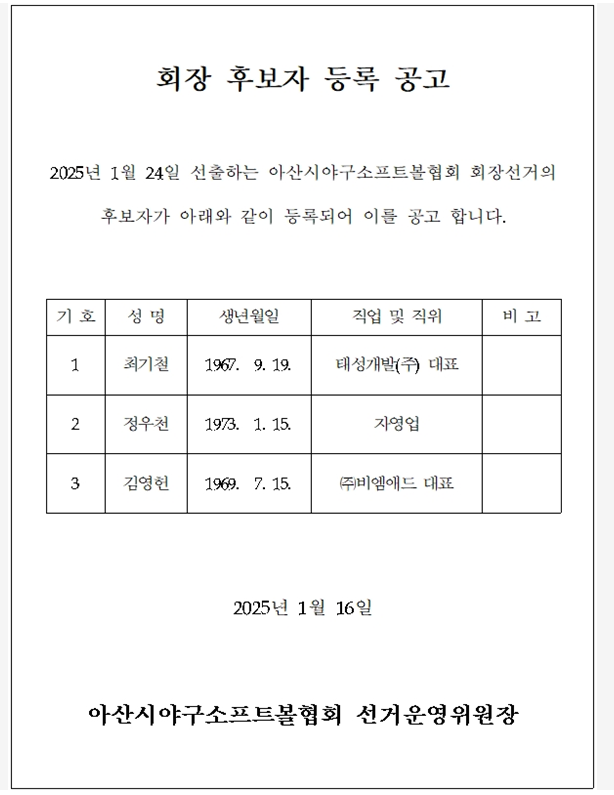 안녕하십니까? 경기 이사 김태훈입니다. 25년 아산시 야구 소프트볼협회장 후보자 등록 공고 합니다. 후보자별 이력서및 공약은 자유게시판에 별도로 올렸으니. 많은 관심 부탁드립니다.