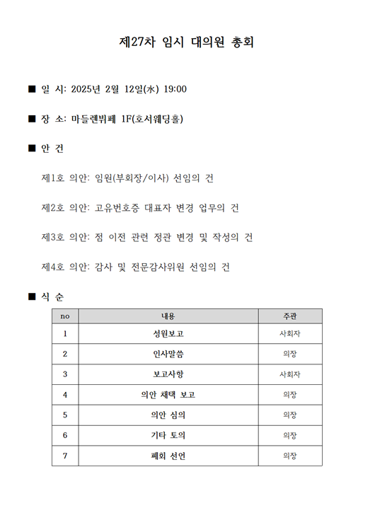 안녕하십니까? 前) 경기이사 김태훈입니다. 25년 집행부가 선임되지 않아 대리 공지 합니다. 이점 양해 부탁드립니다.