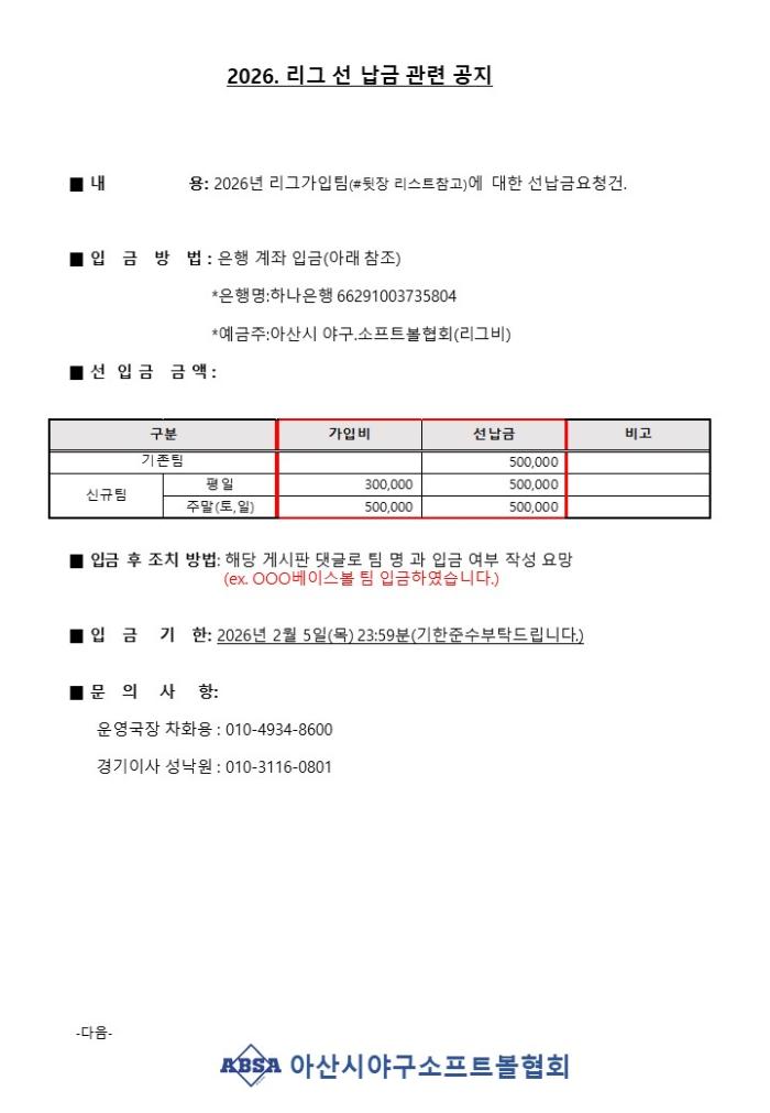 2026 아산리그 참여팀 선납금입금관련 건(현기준 참여팀리스트포함)